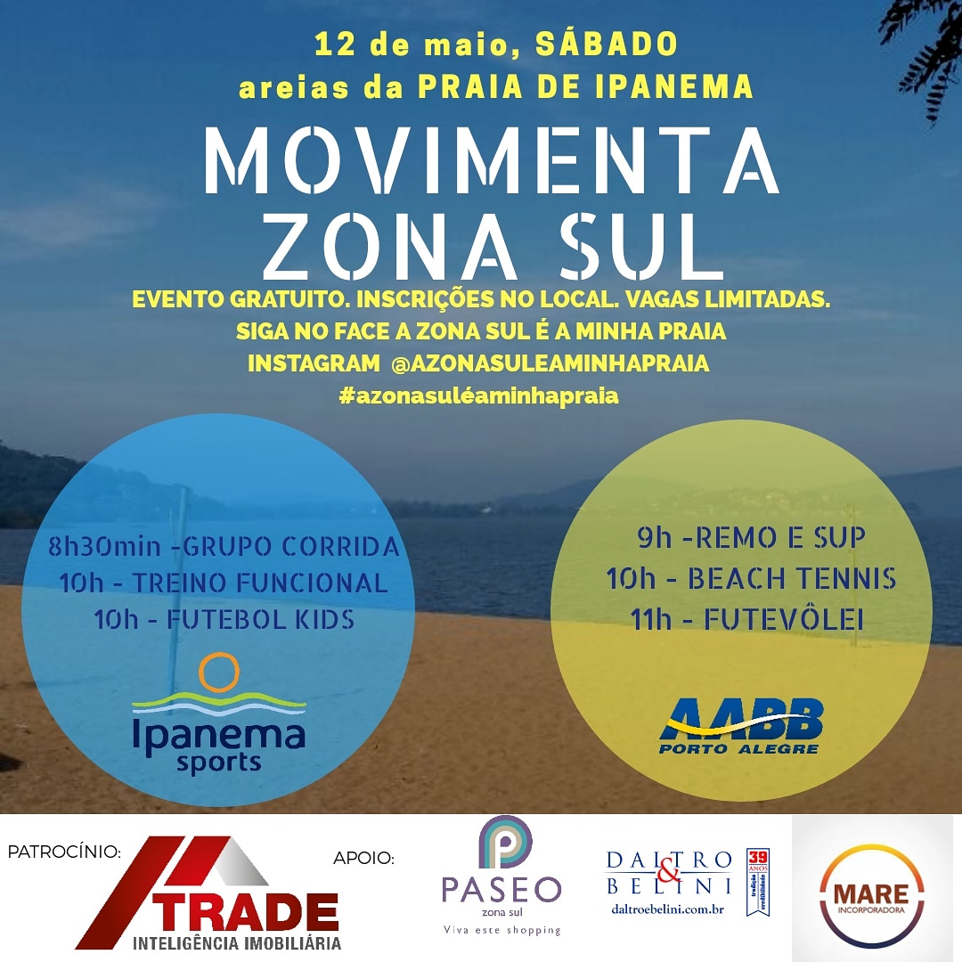 O projeto A Zona Sul é a Minha Praia promove neste sábado (12) o evento Movimenta Zona Sul: uma manhã especial, na faixa de areia da praia de Ipanema, dedicada à experimentação intensa de diversos tipos de esportes. A ação tem como foco valorizar e aproximar moradores e visitantes de uma das regiões mais aprazíveis da cidade e incentivar a prática de esportes.